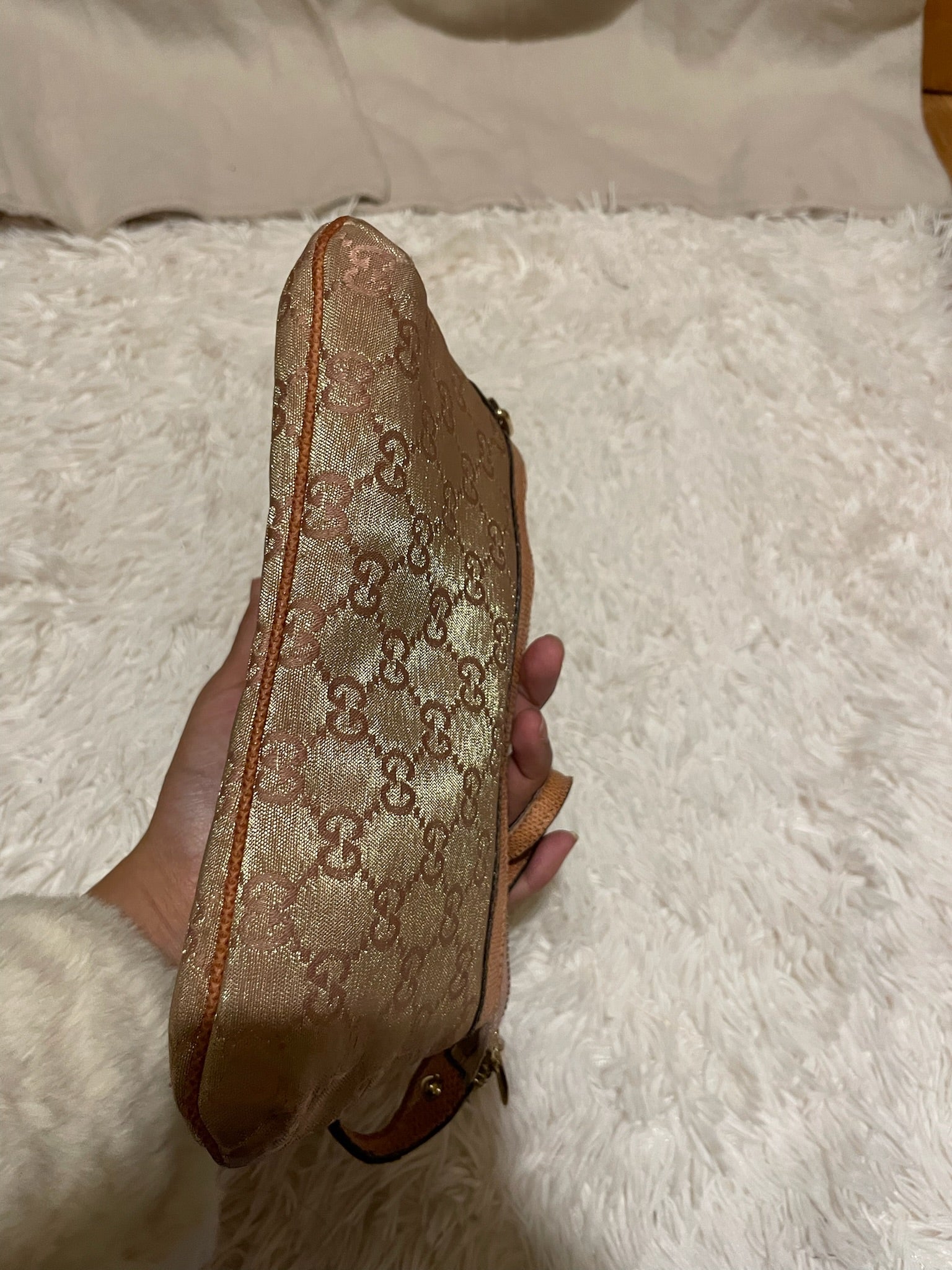 This Gucci shoulder bag is crafted from shimmering pink-gold GG monogram canvas with leather trim. Designed with a zip-top closure, single leather strap, and adorned with a bee charm detail, it’s a chic and compact bag perfect for both daily use and evening outings. Comes with original Gucci dust bag.