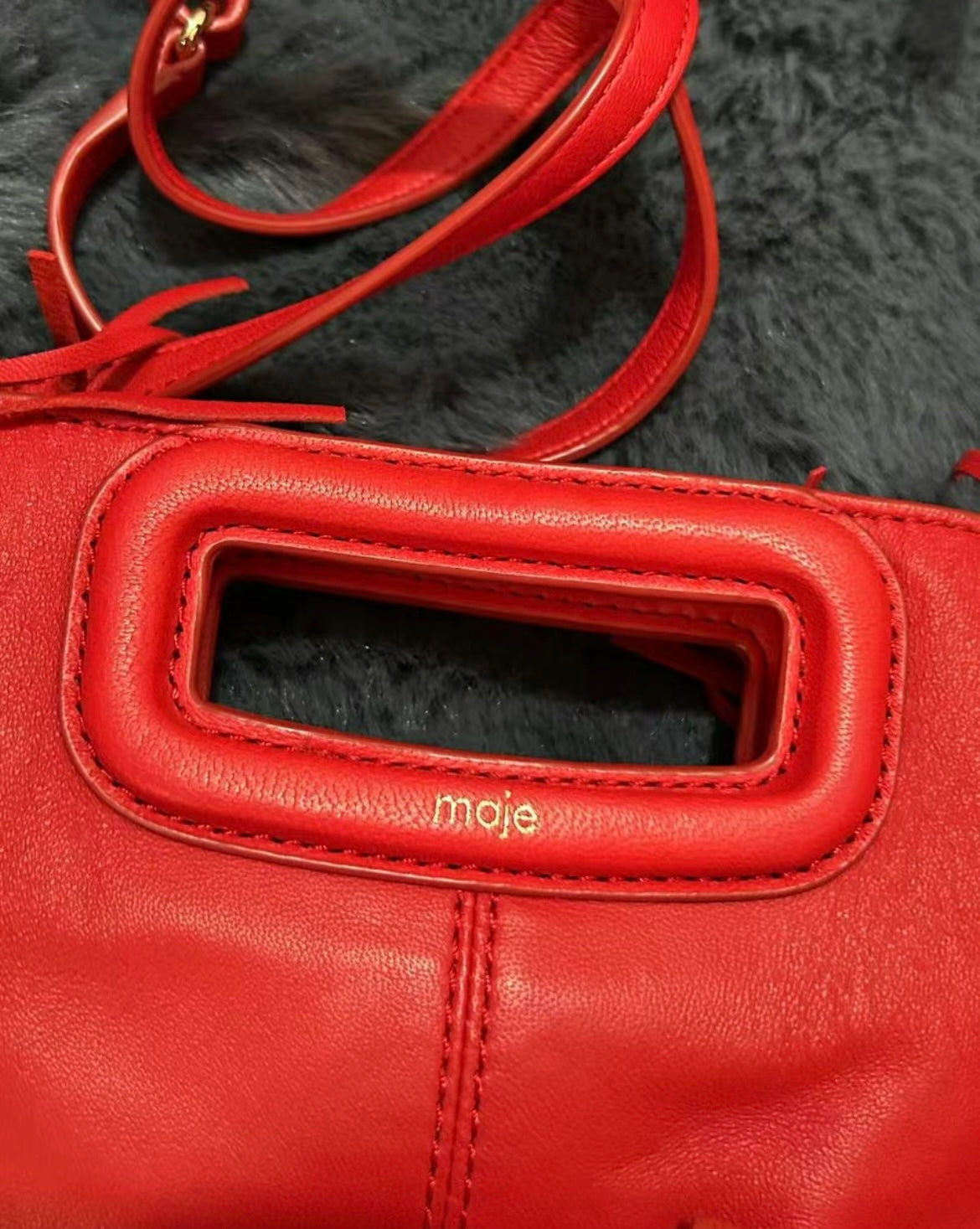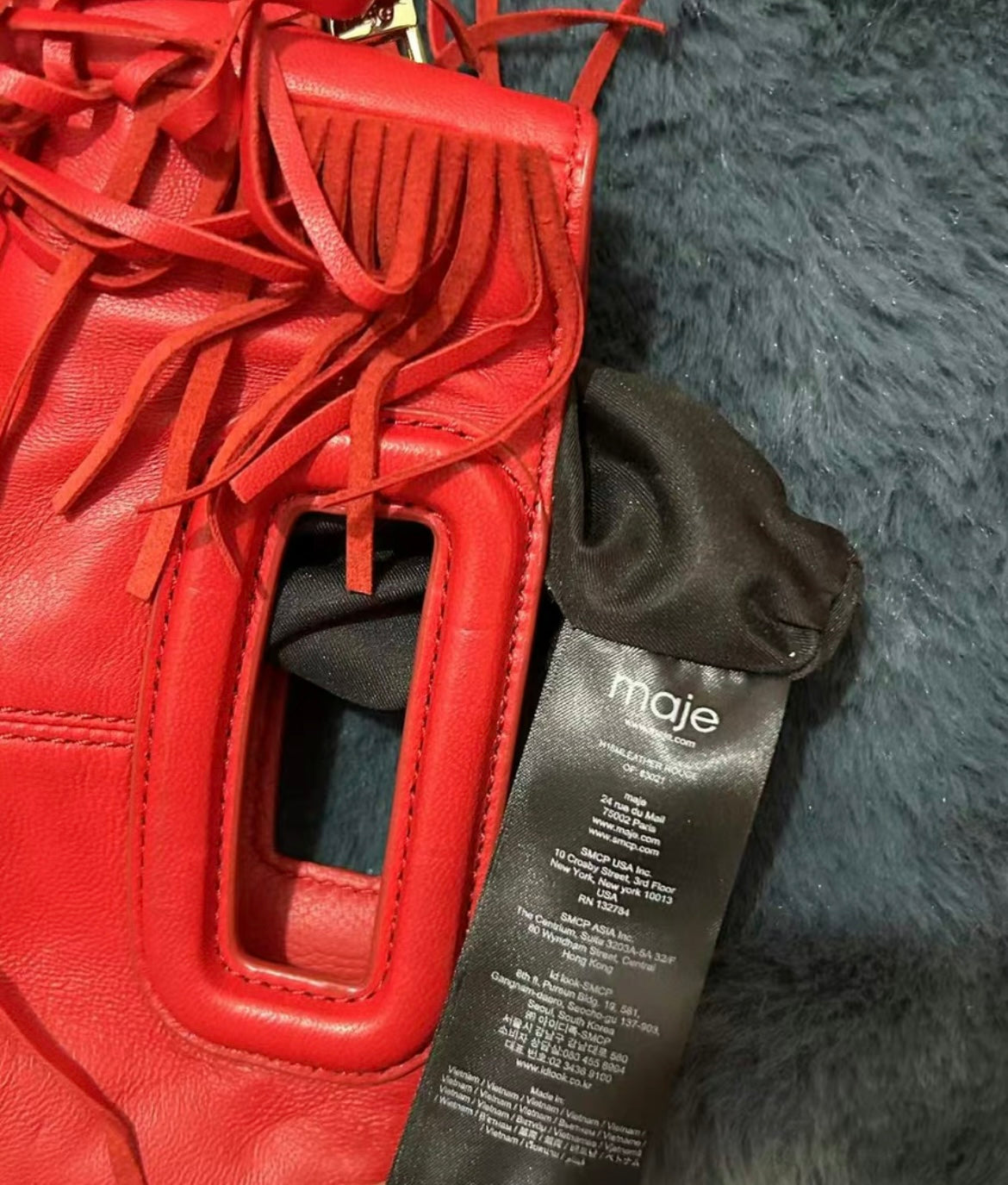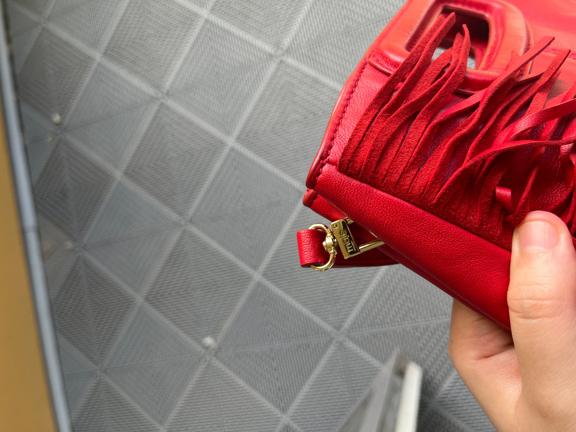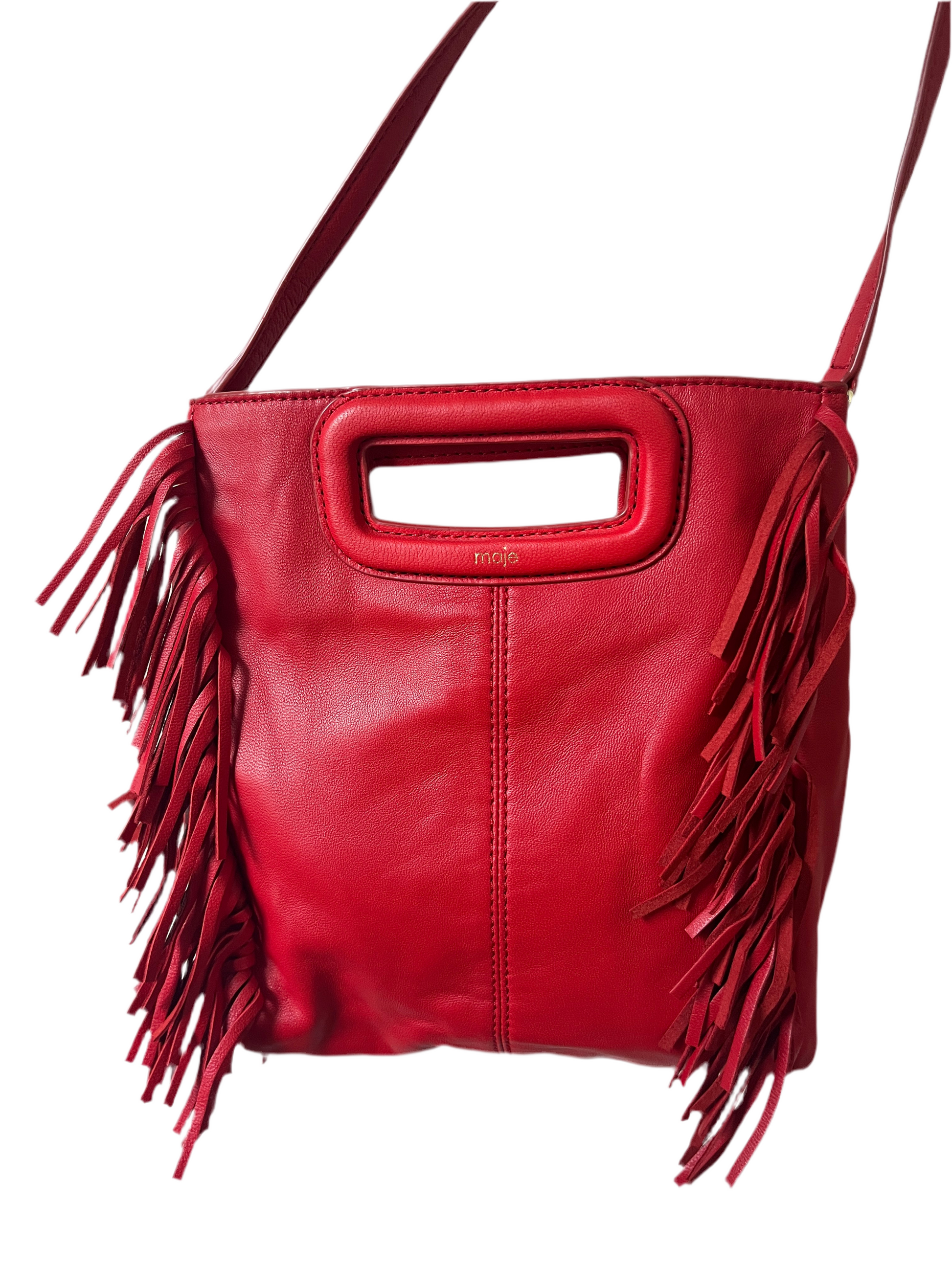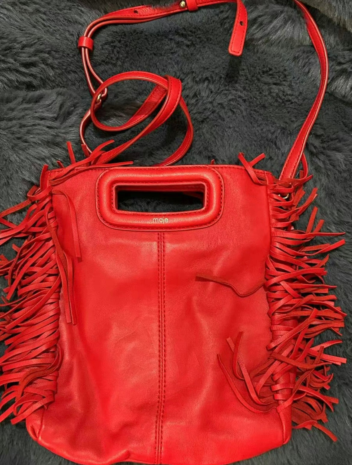 Crafted from smooth red leather, this Maje M Mini bag features signature side fringes, a rectangular cut-out handle, and a detachable shoulder strap. Its structured yet bohemian design makes it perfect for adding a bold statement to any outfit.