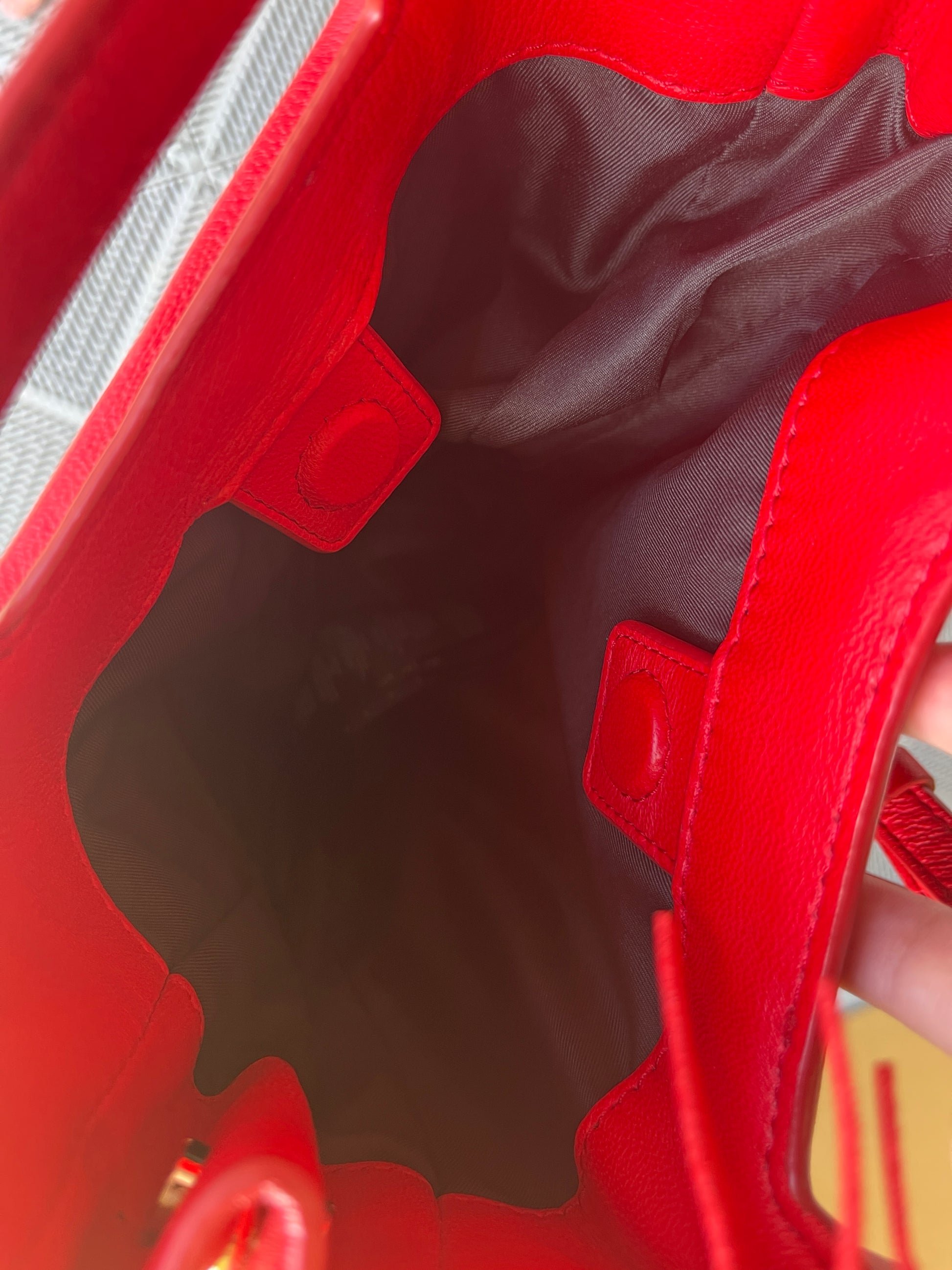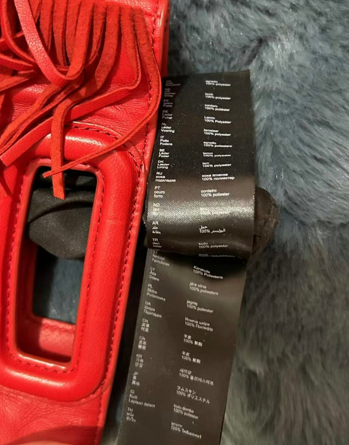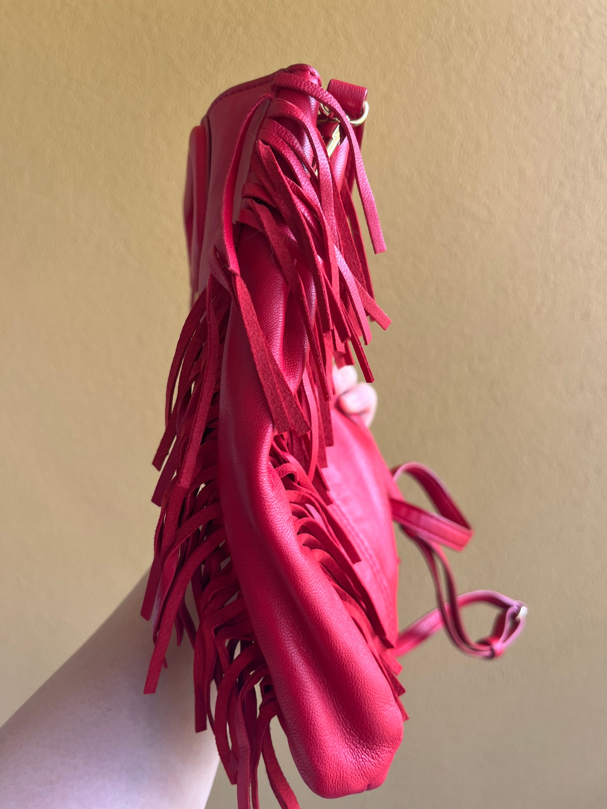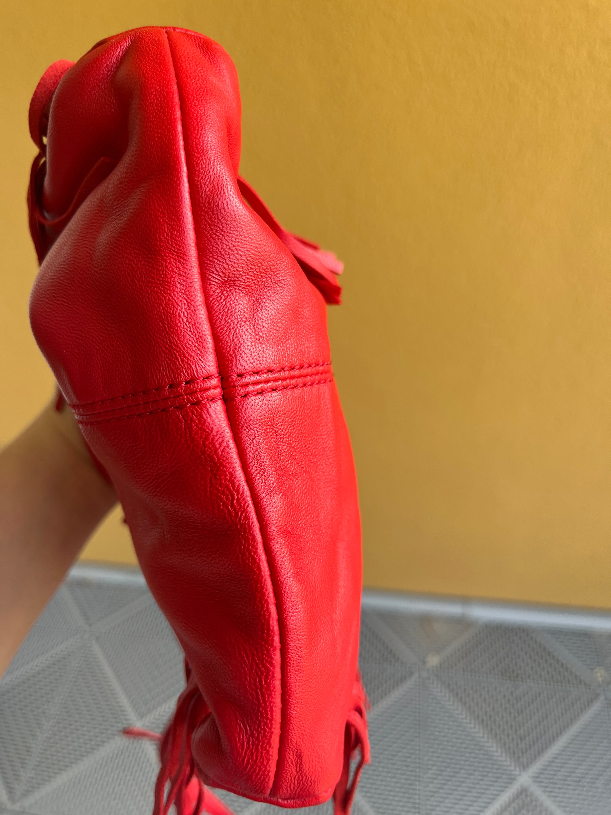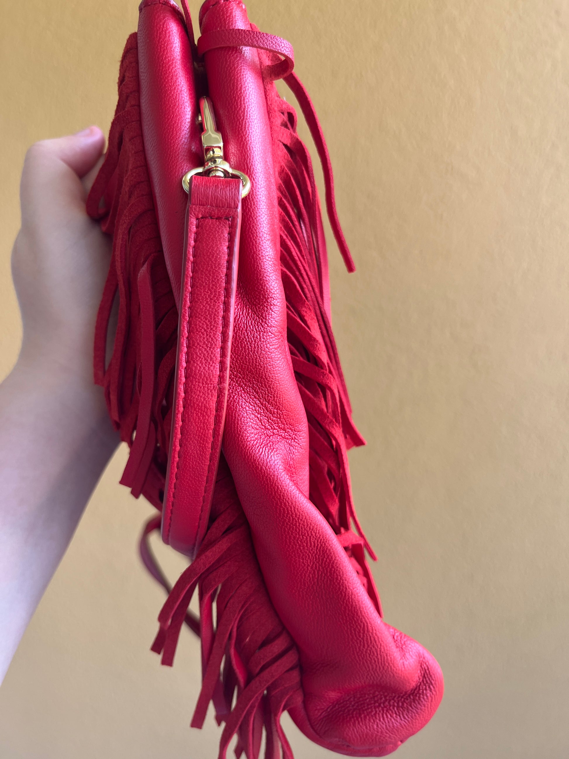 Crafted from smooth red leather, this Maje M Mini bag features signature side fringes, a rectangular cut-out handle, and a detachable shoulder strap. Its structured yet bohemian design makes it perfect for adding a bold statement to any outfit.