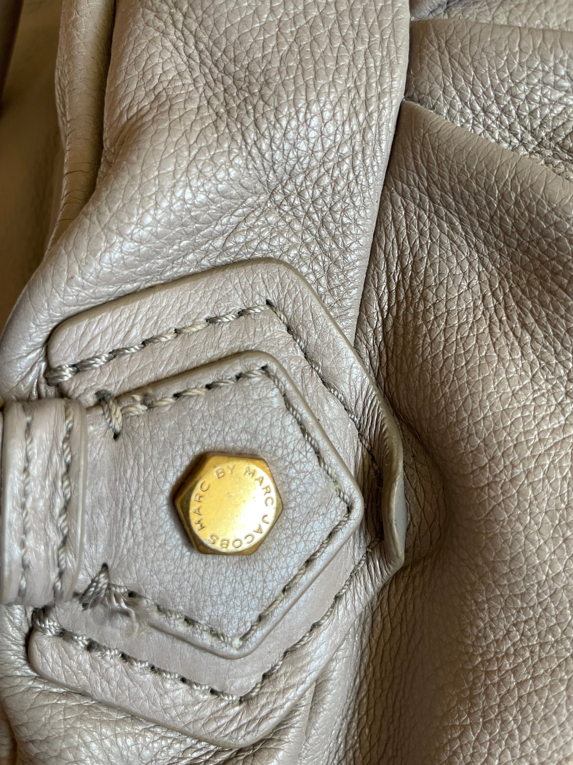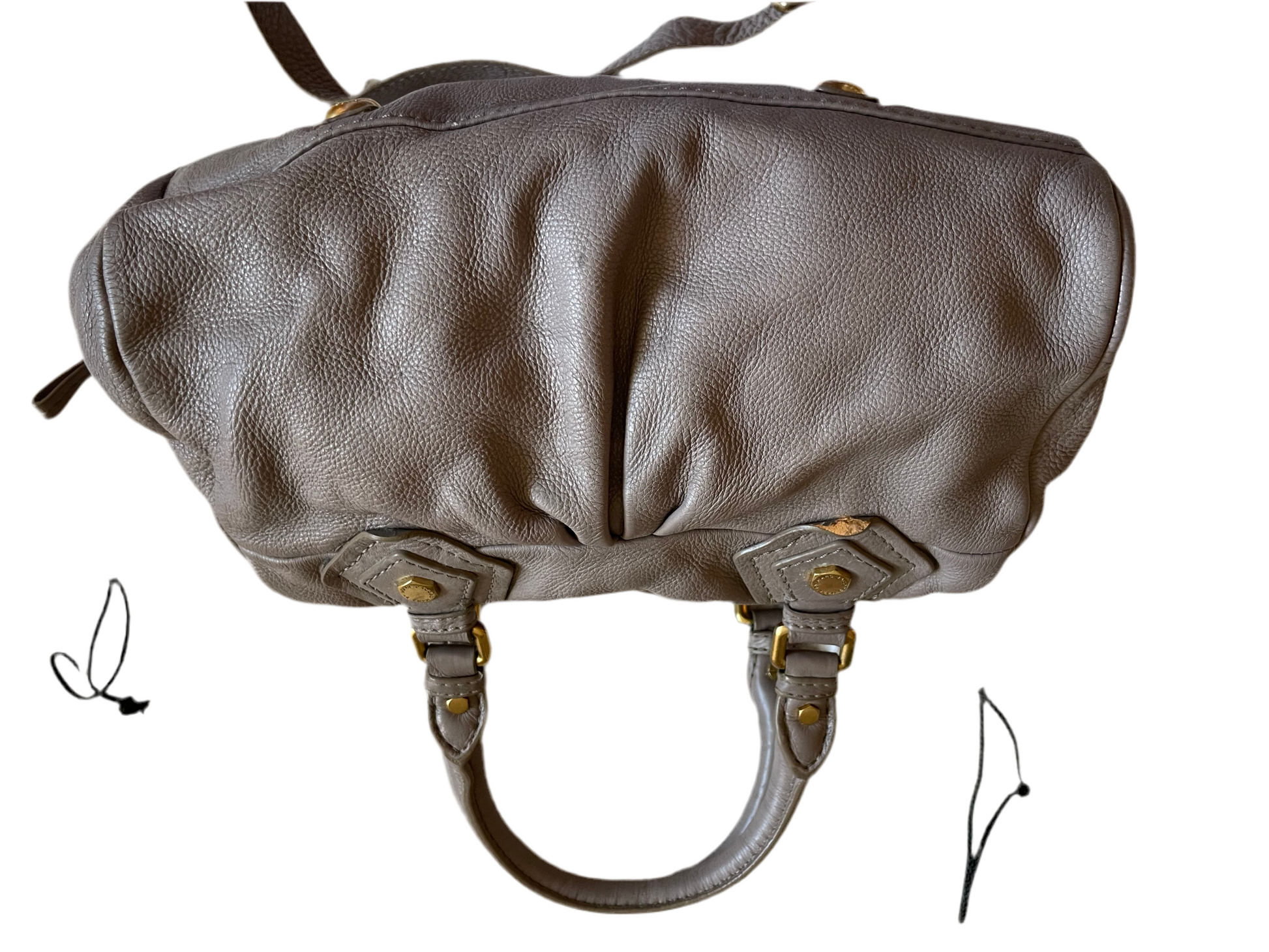 This Marc by Marc Jacobs satchel is crafted from soft pebbled taupe leather, featuring subtle pleated details, dual rolled handles, and a signature gold-tone logo plaque. The interior is lined with the iconic logo fabric and includes a zip pocket and slip compartments, combining elegance with practicality. Comes with a detachable shoulder strap for versatile styling.