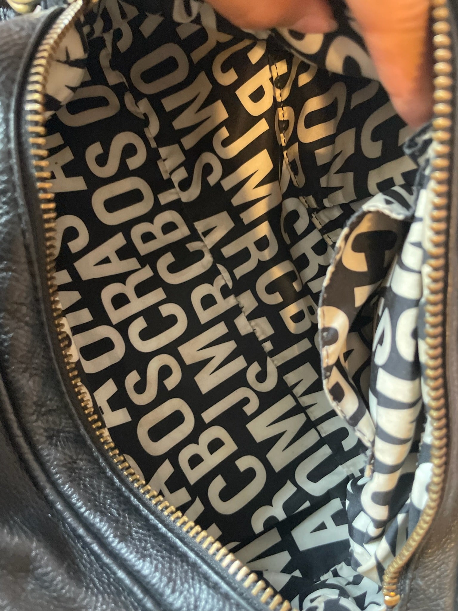 A Marc by Marc Jacobs Classic Q Baby Aidan satchel in soft, grained black leather. Designed with pleated detailing, rolled handles, and gold-tone hexagonal hardware with the brand’s signature nameplate. The detachable shoulder strap allows both hand-carry and crossbody wear. The interior is lined with Marc Jacobs’ bold logo fabric and features a zip pocket and two open compartments for easy organization.