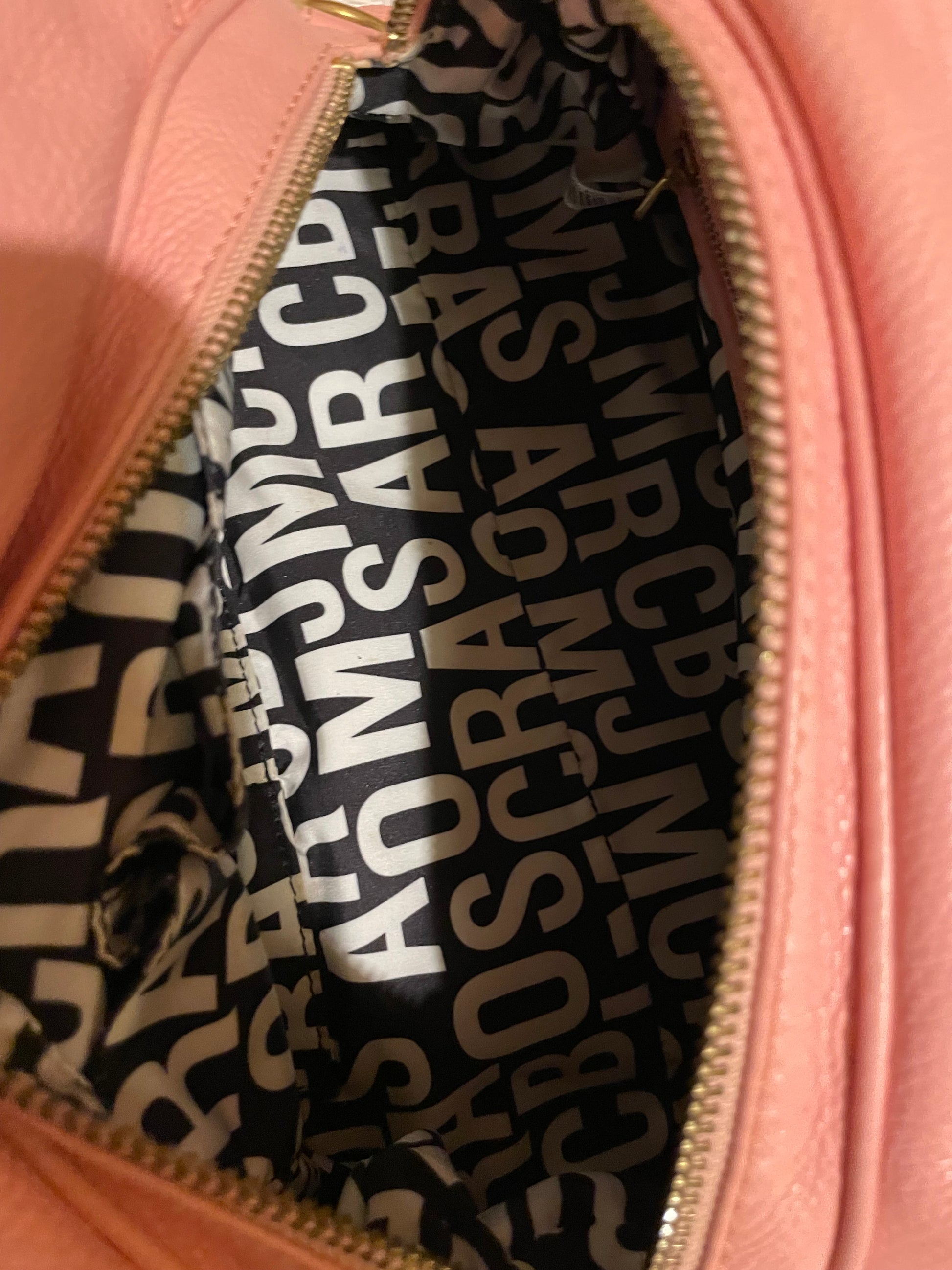 This Marc by Marc Jacobs satchel is crafted from soft pebbled blush pink leather, featuring pleated details, dual rolled handles, and a signature gold-tone logo plaque. The interior is lined with logo fabric and includes a zip pocket and slip compartments, offering both style and practicality. Comes with a detachable shoulder strap for versatile wear.