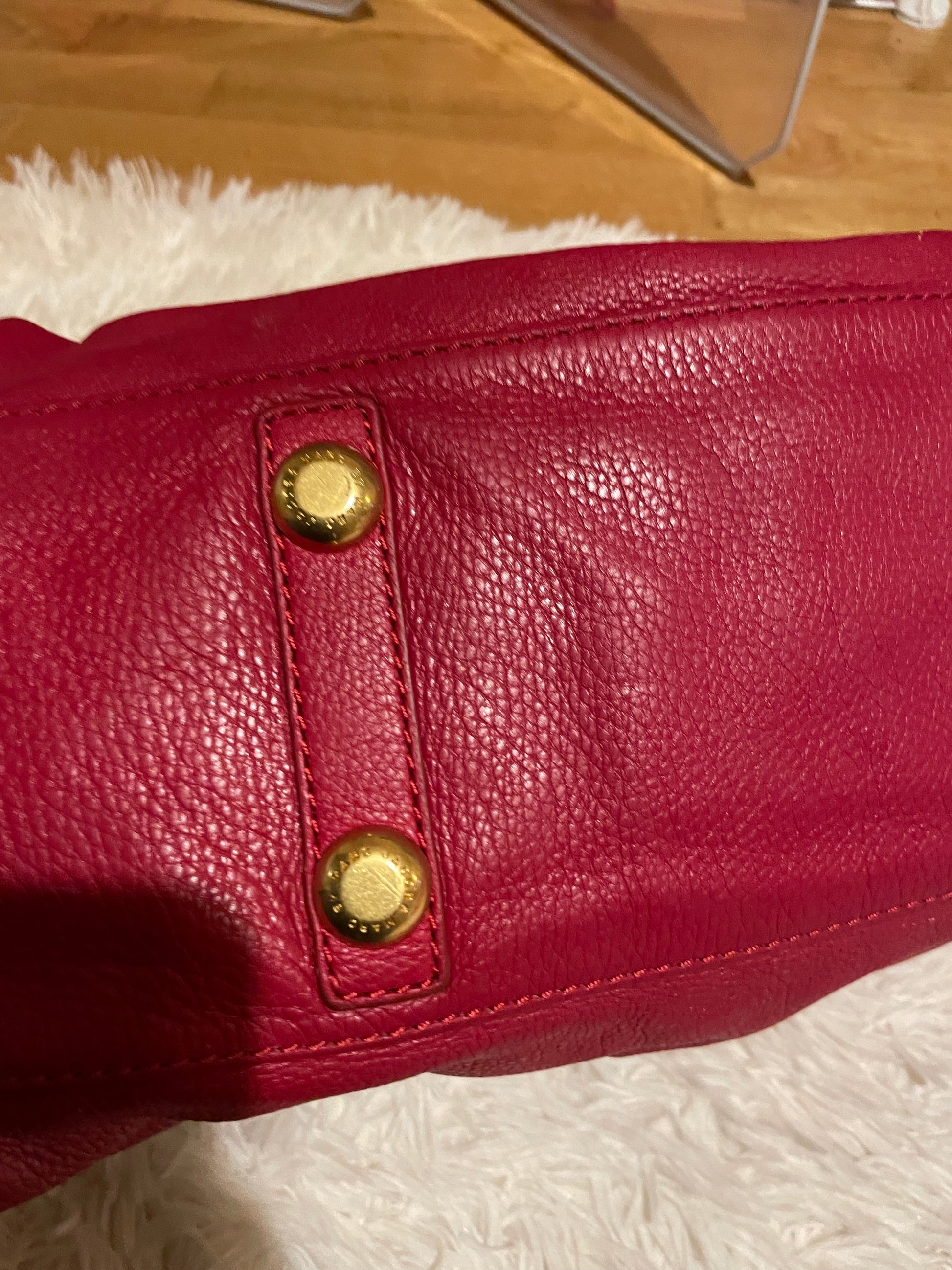 This Marc by Marc Jacobs satchel is crafted from soft pebbled deep red leather, featuring pleated details, dual rolled handles, and a signature gold-tone logo plaque. The interior is lined with logo fabric and includes a zip pocket and slip compartments for easy organization. Comes with a detachable shoulder strap for versatile wear.
