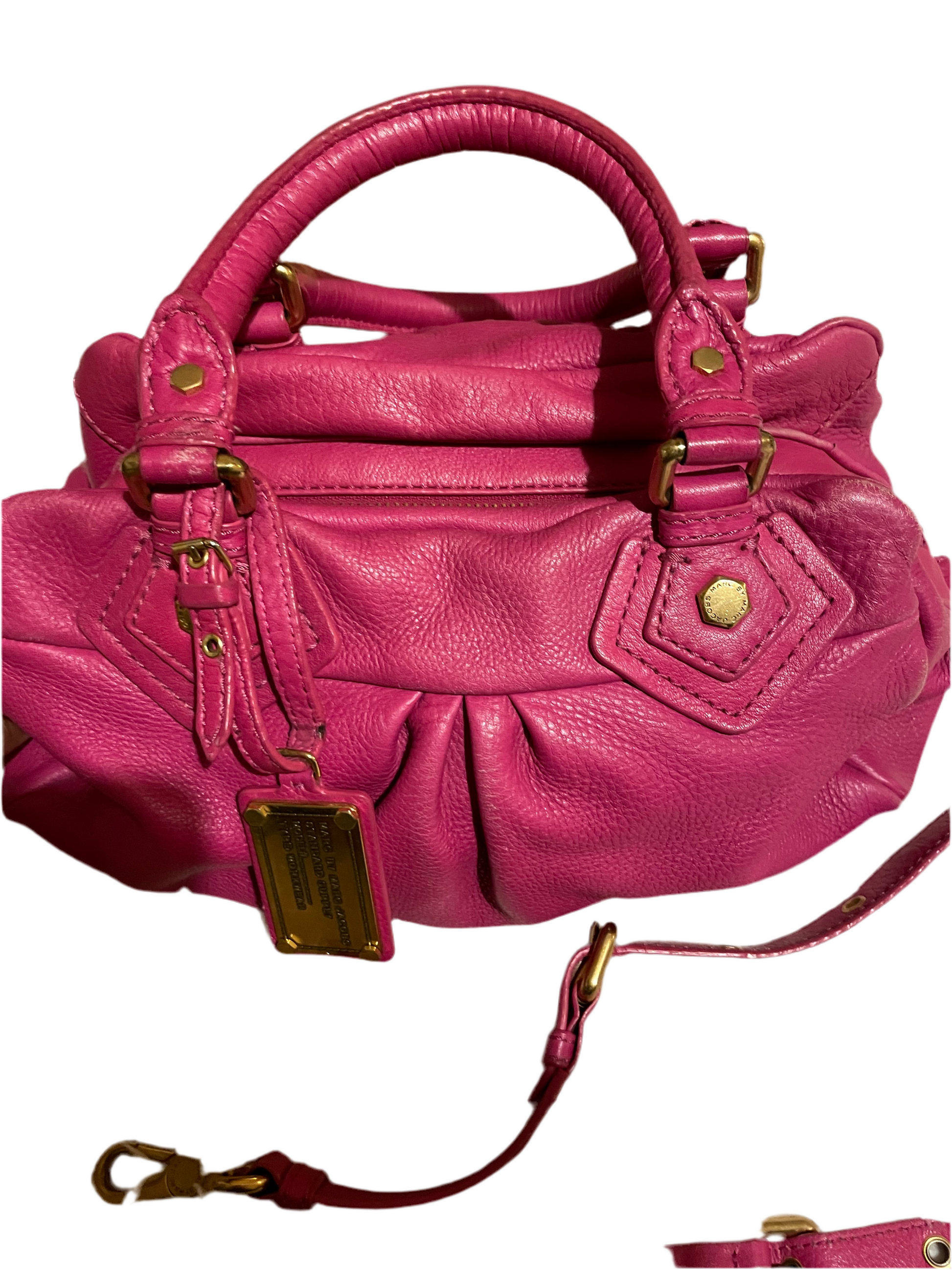 This Marc by Marc Jacobs satchel is crafted from supple pebbled leather in a striking hot pink hue. It features the brand’s signature pleated detailing, rolled handles, and a polished gold-tone logo plaque. The interior is fully lined with logo fabric and includes both a zip pocket and slip compartments, offering functionality with a bold, feminine touch. Comes with a detachable shoulder strap for versatile wear.