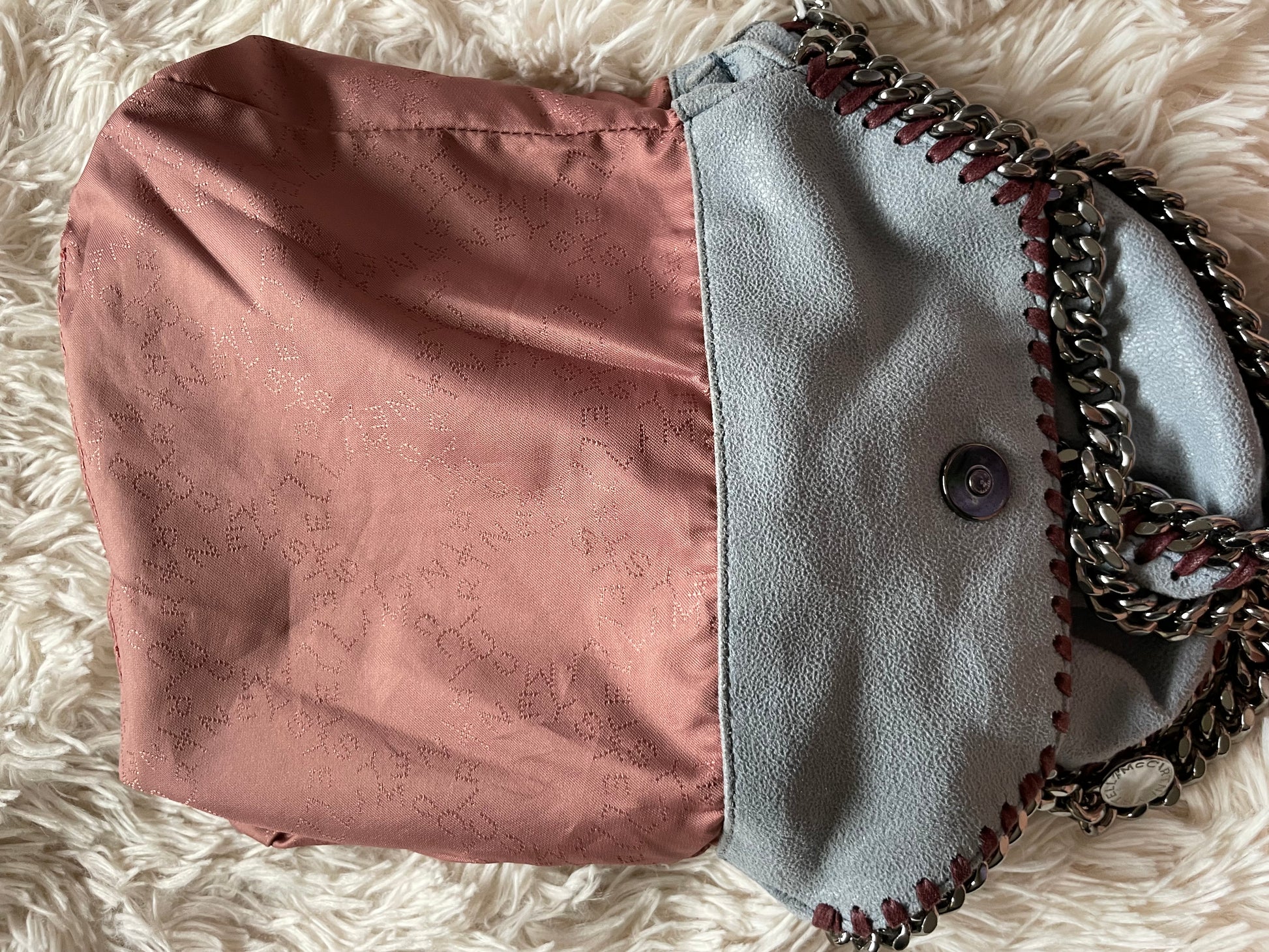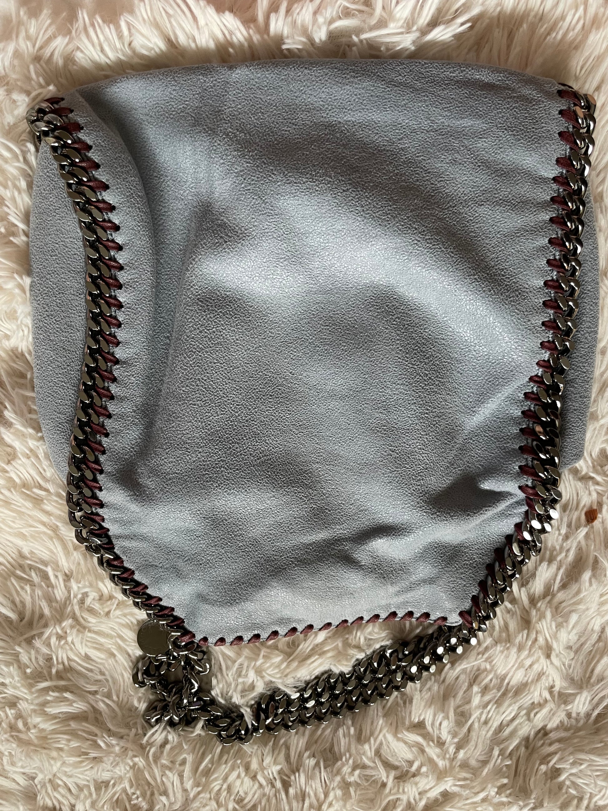 This iconic Falabella tote is crafted from light grey vegan Shaggy Deer fabric, accented with Stella McCartney’s signature diamond-cut chain trim and whipstitch detailing in a deep burgundy tone. The compact yet practical silhouette can be carried by hand or over the shoulder, perfect for daily essentials.