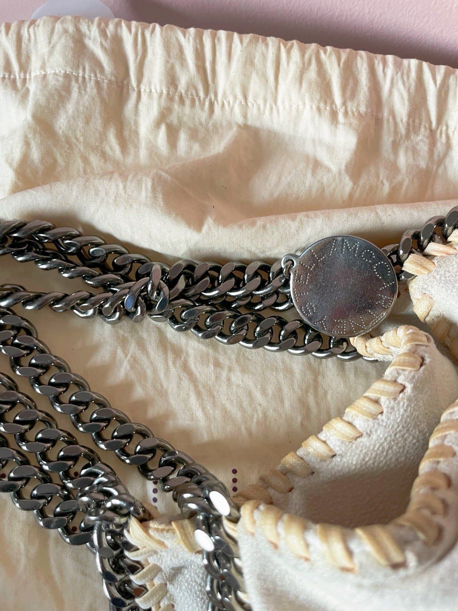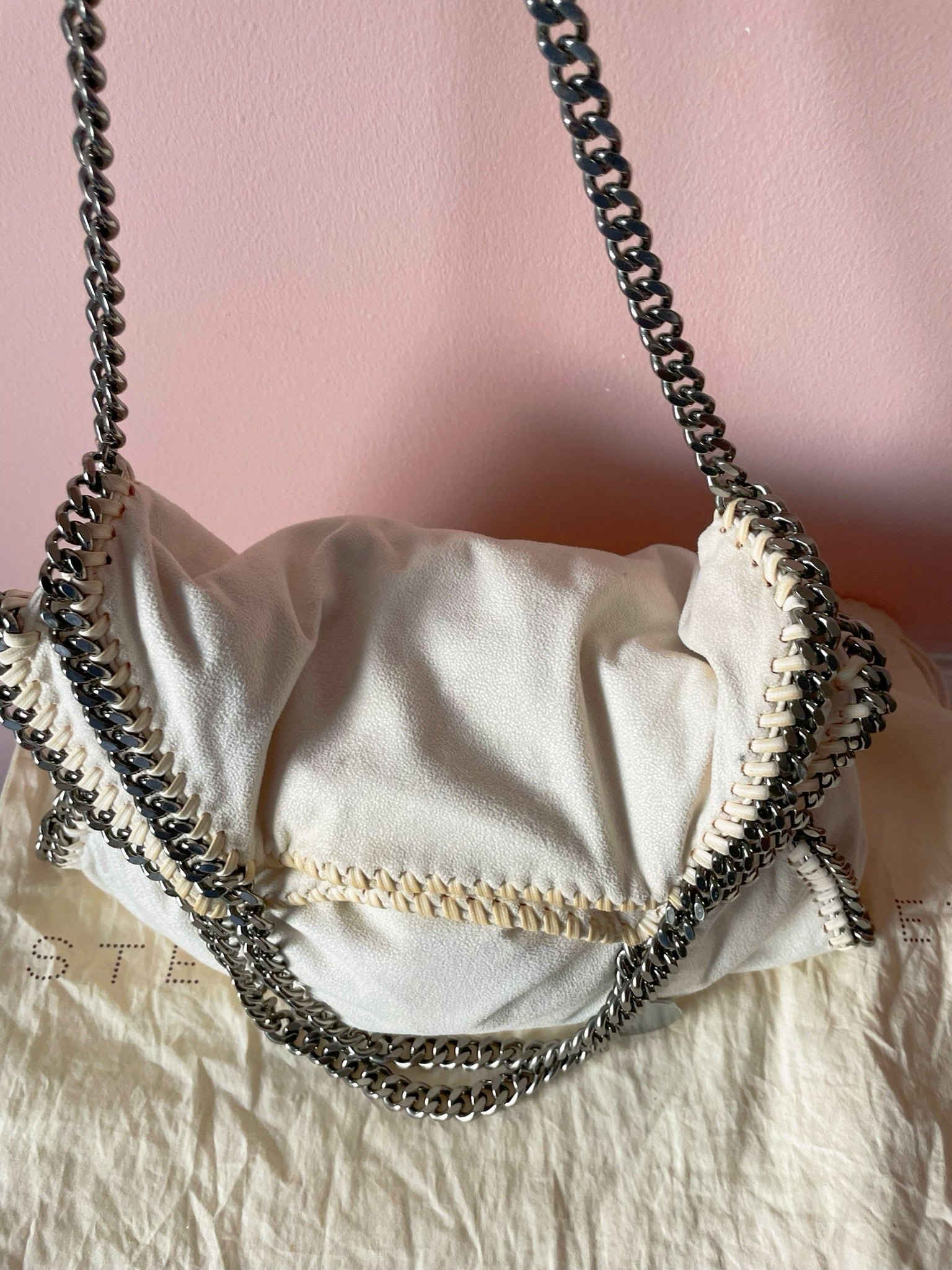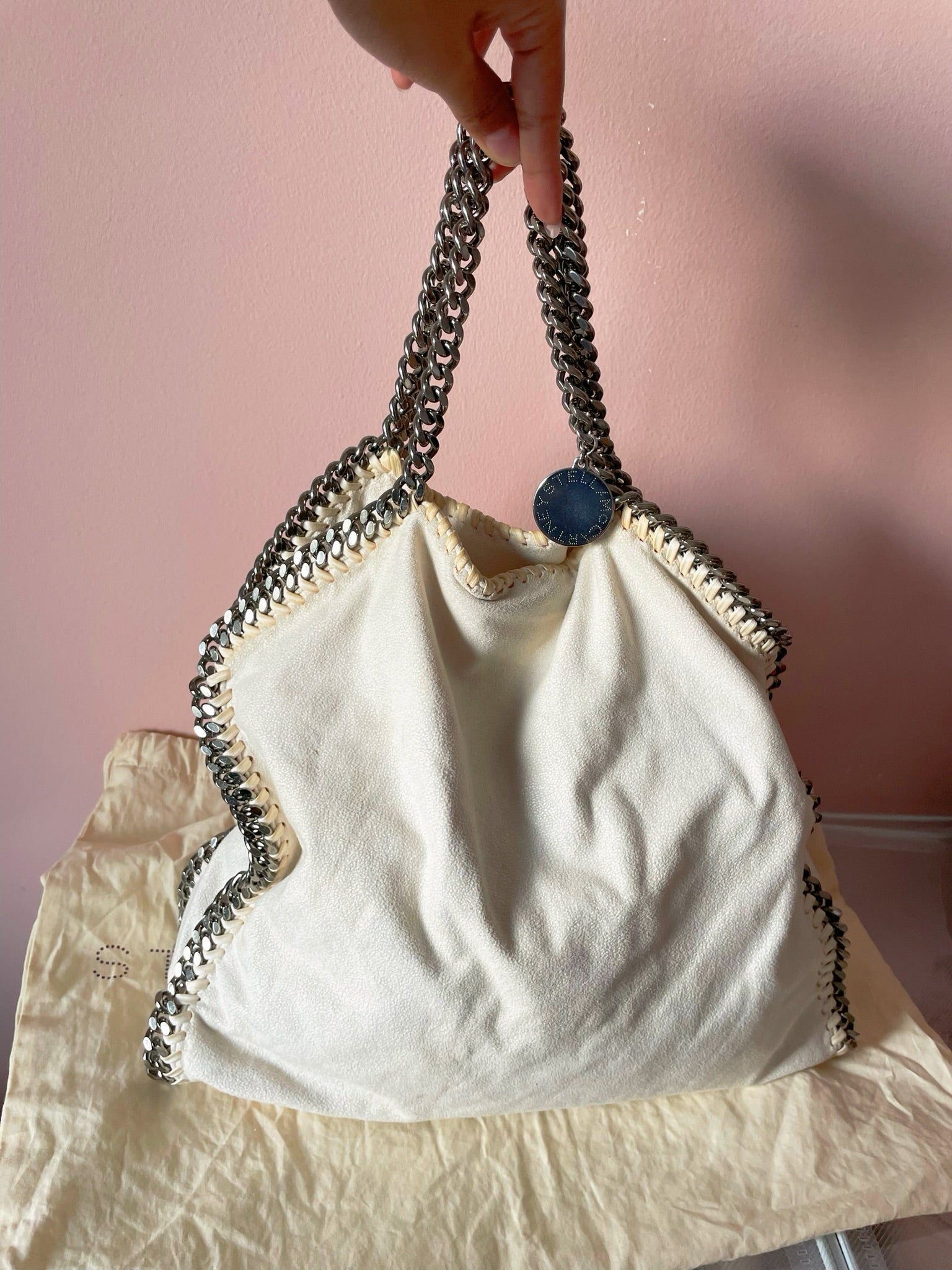 This iconic Stella McCartney Falabella tote is crafted from soft eco-friendly faux suede in an elegant off-white shade. It features the signature whipstitch detailing and ruthenium chain trim with dual top handles and a longer chain strap for versatile carry options. Lightweight yet spacious, perfect for everyday use.